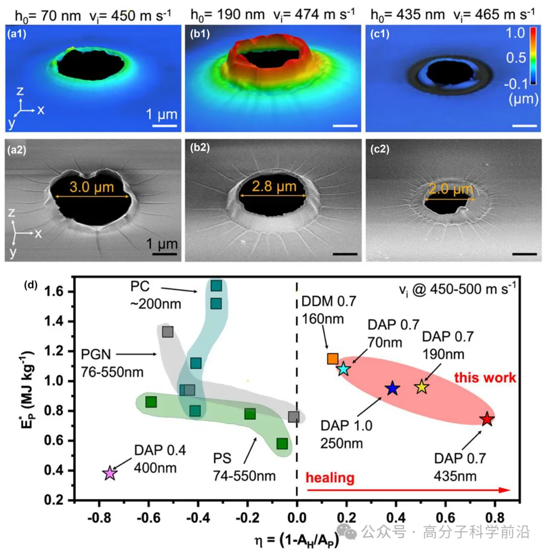 1.穿孔自愈性:DAP薄膜的穿孔直径(dh)比弹体直径(dp)小38%(图1c),而传统玻璃态热塑性材料(如聚苯乙烯、聚碳酸酯)的穿孔通常更大。