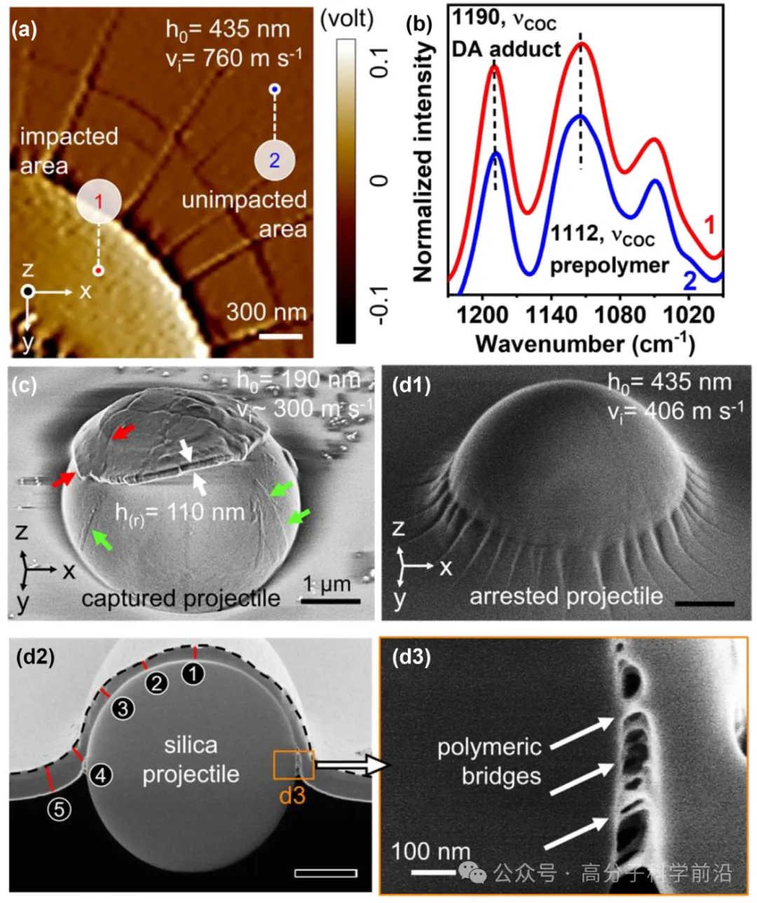 3.化学结构恢复:红外纳米光谱(AFM-IR)证实,冲击区域的Diels-Alder键特征峰(1190 cm⁻¹)与未冲击区一致,表明动态键在冲击后成功重组(图3b)。