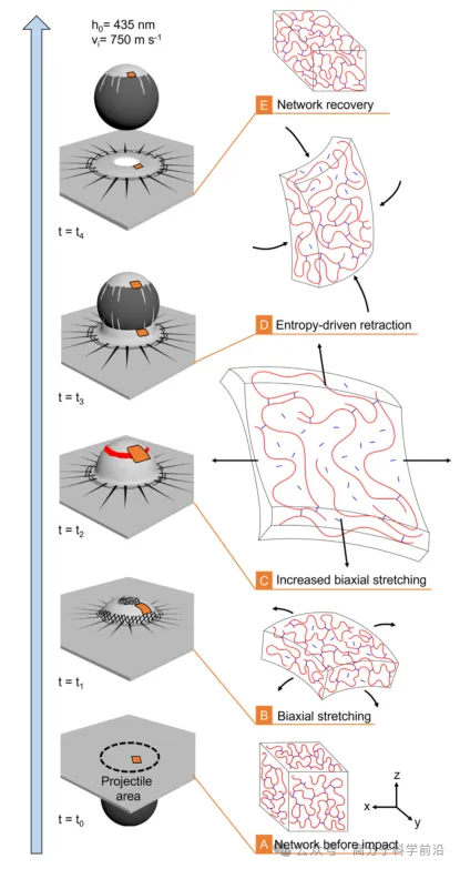 3.穿孔断裂与弹性恢复:冲击后,未完全解离的网络在冷却过程中通过熵弹性收缩闭合穿孔。