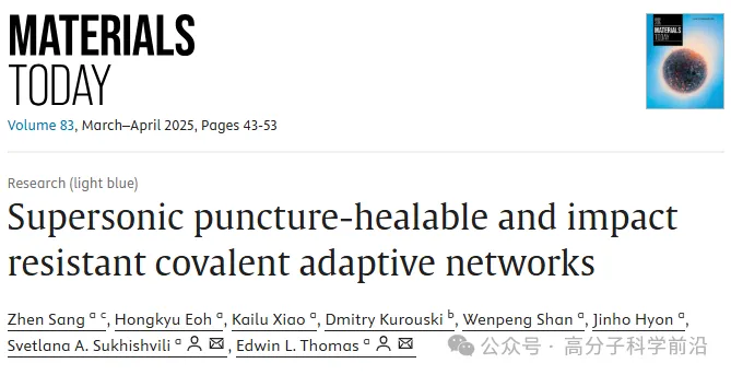 近日,材料科学领域取得重要突破,美国工程院院士、美国人文与科学院院士、美国得克萨斯农工大学教授Edwin L. Thomas、Svetlana A. Sukhishvili研究团队报道了一种基于Diels-Alder聚合物(DAP)的共价自适应网络(CAN)薄膜。该材料在超音速微弹体冲击下展现出显著的穿刺自愈能力与动能吸收性能,为开发新一代抗冲击防护材料提供了新思路。相关论文以Supersonic puncture-healable and impact resistant covalent adaptive networks为题,发表在《Materials Today》期刊,第一作者为Sang Zhen。