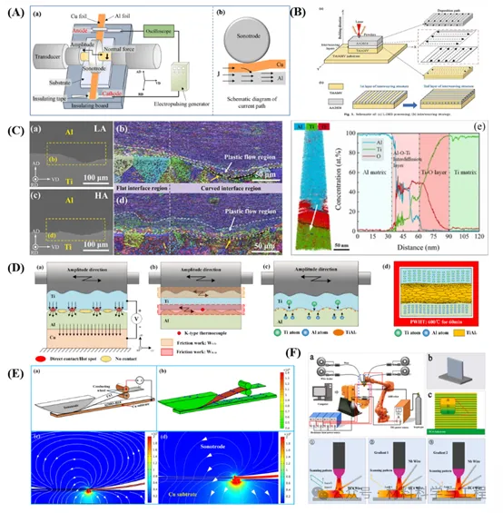 图 13. (A)电脉冲辅助超声增材制造工艺示意图;(B) (a)L-DED处理图;(b)交错结构;(C) II型界面形貌特征;(D)电流辅助UAM工艺示意图;(E)电流密度分布数值模拟;(F) (a) MWAAM系统示意图。(b) MWAAM合金成分示意图;(c)不同层数MWAAM TC4/Nb多材料合金双弧增材制造工艺流程图