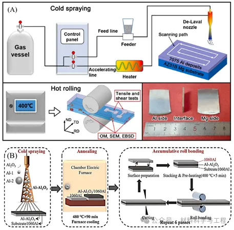 图5. (A) CS+HR原理图及Mg/Al复合板样品;(B)CS+ARB实验过程示意图