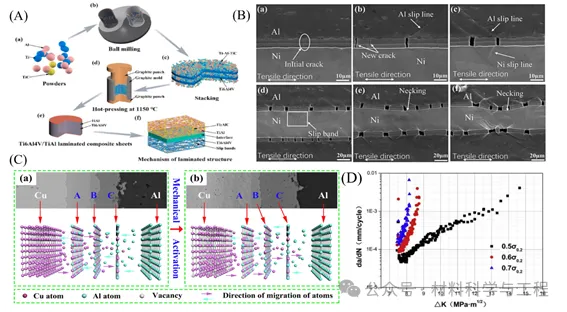 图11. (A) Ti6Al4V/TiAl复合板制备工艺示意图;(B)裂纹萌生和扩展过程;(C) Cu/Al界面上IMC层形成和生长示意图;(D) Ti/Al复合材料层合板疲劳裂纹扩展速率曲线