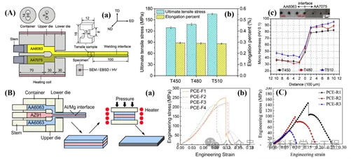 图7. (A). (a)挤压装置示意图;(b) 挤压AA6063/AA7075异种复合板的拉伸性能;(c)复合板工程应力-应变曲线;(B)PCE-F制备板材示意图及力学性能曲线