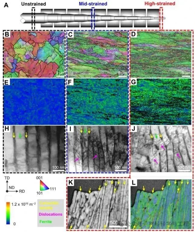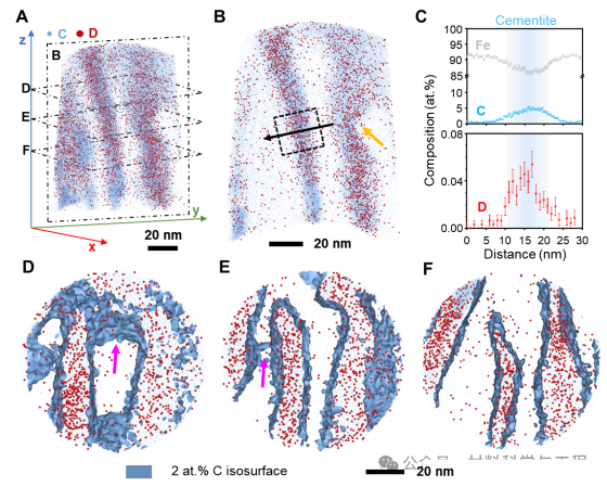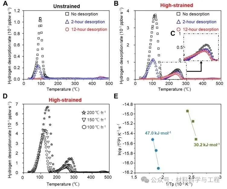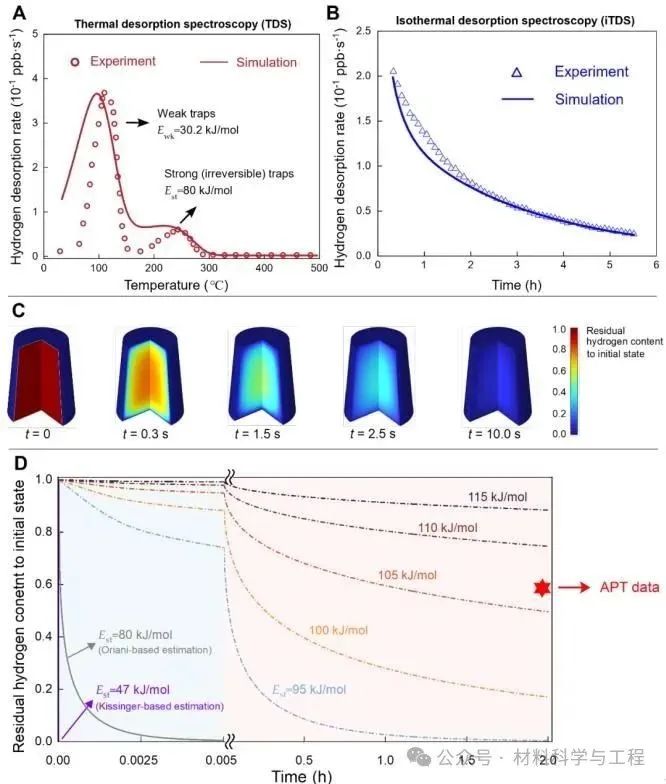 可扩散氢原子在钢材中的存在会导致钢材发生氢脆,损害其结构完整性。一种潜在的解决方案是在钢材的微观结构中引入强氢陷阱,以固定氢原子,阻止其扩散到应力集中区域(即氢脆最易发生的区域)。然而,制造具有有效强氢陷阱的材料通常需要添加昂贵的合金元素,这无疑增加了生产成本,阻碍了该策略在钢铁工业中的应用。在本研究中,悉尼大学联合牛津大学、南洋理工大学的研究人员以珠光体钢作为模型材料,通过冷拔工艺引入高密度的位错,并且使这些位错在渗碳体-铁素体界面处聚集并缠结。这不仅提高了钢材的强度,还使其氢脆敏感性降低,令氢脆不易发生。研究人员使用环境可控的三维原子探针技术直接证实,这些缠结位错能牢固地捕获氢原子,阻碍氢原子的扩散,从而使该钢材表现出较低的氢脆敏感性。该发现为生产兼具高强度和高抗氢脆的金属材料提供了一条途径,强调了利用晶体缺陷作为经济且高效氢陷阱的潜力。 背景介绍: 氢在结构材料中的吸收会导致氢脆,大幅度地降低材料的韧性,这对用于氢气运输和储存的钢结构系统构成极大的失效风险,使得此类钢材的维护成本增高,并严重威胁脱碳与氢能经济大规模应用的进程。为降低钢材发生氢脆的风险,需在金属部件生产开始过程中便尽量减少氢吸收,比如,在热处理期间控制钢材与潮湿环境的接触面积,或对钢材进行烘烤处理以去除其内部吸收的氢,此外,也可以施加表面涂层以减缓氢的吸收。更巧妙的方法是,利用材料本身的晶体缺陷作为氢陷阱来减少自由扩散氢的量,从而降低氢原子聚集而引发的裂纹萌生和扩展的可能性,最终减缓氢脆现象。然而,氢陷阱的有效性仍存争议,传统理论认为强陷阱(如结合能>70 kJ/mol)可能快速释放氢,且缺乏实验验证。 在过去的研究中,科学家们利用热脱附光谱(TDS)测量氢吸附与脱附的情况来判断氢陷阱的存在与类型,但无法明确具体是何种晶体缺陷扮演何种氢陷阱;三维原子探针(APT)技术可以直接观察氢在特定微观结构(如位错、晶界、碳化物)中的捕获情况,结合低温转移(cryo-transfer)技术可以提供完整、准确的氢捕获图谱,但该技术受限于仪器本身的视场问题,且样品具有破坏性,无法重复使用来鉴定同一样品中的不同氢陷阱类型。 为了解决这一问题,本研究通过冷拔工艺在模型珠光体钢中引入多种晶格缺陷作为强弱氢陷阱,结合环境可控TDS与APT实验,验证了强陷阱在室温下长期保留氢的能力,并且指明了强弱氢陷阱在脆化过程中表现出的性质,同时通过数值分析与实验结果做对比,揭示了传统氢捕获模型可能在分析纳米结构缺陷上有所不足。此研究成果为开发抗氢脆的高强高抗氢脆合金提供了实验依据和成本效益高的工艺方法,推动了潜在服役于氢能系统的材料设计进展。 全文解析: 图1展示了珠光体钢丝在冷拔过程中的微观组织演变。电子背散射衍射(EBSD)数据展示了无应变、中等应变和高应变钢丝的晶粒尺寸从27.6μm减小到2.19μm,晶粒在变形过程被拉长、破碎。几何必要位错(GNDs)图表明:随着应变增加,位错密度从9.78×1014m⁻²升至25.49×1014m⁻²,显示了变形过程引入了高密度位错。扫描透射电子显微镜(STEM)图像显示渗碳体-铁素体界面附近位错密度急剧增加,特别是高应变样品发生了位错切割渗碳体的现象。透射菊池衍射(TKD)分析进一步确认高应变样品中渗碳体-铁素体界面附近的高位错密度,为研究氢捕获行为与晶体缺陷关系提供了晶体结构上的认识。 图1. 珠光体钢样品变形过程中的组织演变。(A) 展示了珠光体钢丝样品的冷拔工艺流程,标记了无应变(黑色)、中等应变(蓝色)和高应变(红色)三种样品的制造过程。(B-D) 是三个样品的EBSD反极图,叠加了衬度和晶界图。(E-G) 是几何必要位错(GNDs)图,显示位错密度变化。(H-J) 是沿晶带轴下拍摄的三种样品的STEM-ABF图像。(K-L) 是高应变样品的TKD结果,(K) 是带衬度图,(L) 是GNDs图 图2显示了对无应变和高应变条件下的样品,经充氢后通过TDS进行的氢吸附和脱附处理后的氢含量和氢捕获情况的结果。图A无应变样品仅有低温下的氢的峰,表明无应变样品只存在弱氢陷阱捕获氢。而在高应变样品中,除了低温下逸出的氢的峰外,还出现了高温逸出的氢的峰,如图B所示,这表明冷拔过程引入了强氢陷阱。之后研究人员对充氢后的样品进行真空脱附处理后在测量氢捕获情况,发现随着真空脱附时间的延长,弱氢陷阱捕获的氢含量逐渐下降,当脱附时间达到12小时后,弱氢陷阱捕获的氢完全被释放。相反,强氢陷阱捕获的氢含量不随时间变化而变化,表明强氢陷阱对氢的捕获能力很强,可以长时间有效地固定氢原子。之后,研究人员改变不同的加热速率,继续对高应变样品进行TDS实验,得出弱和强氢陷阱与氢的结合能分别为30.2 kJ/mol和47.0kJ/mol。但此时研究人员对强弱氢陷阱的的性质和具体的晶格缺陷类型还不能判断。 图2. 未应变和高应变样品的氢捕获情况。(A) 未应变样品和 (B) 高应变样品的氢脱附曲线(由TDS测得),分别在室温、真空条件下进行无脱附(黑色)、2小时脱附(蓝色)及12小时脱附(红色)。(C) 为图 (B)中黑色虚线区域的放大视图。(D) 高应变样品在三种不同加热速率下的氢脱附曲线:100℃/h(六边形)、150℃/h(三角形)和200℃/h(星形)。(E) 基辛格图,用于估算图(D)中高温(蓝色)和低温(绿色)氢脱附峰对应的氢与氢陷阱的结合能 于