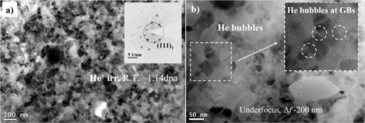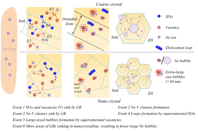 纳米晶材料的辐射耐受性的提高主要源于高密度缺陷汇的战略性引入,特别是晶界(GB)。晶粒尺寸细化已被证明是有效的,通过抑制位错环来减轻辐射诱导的损伤,机理研究证实,GB介导的位错环吸附构成了主要的损伤减轻机制。值得注意的是,最近的研究表明,在苛刻的辐照环境下,纳米晶体系比粗晶材料表现出显著改善的耐辐照溶胀性。然而,纳米晶材料在高剂量下的辐照研究,特别是与商用快堆应用有关的剂量水平辐照稳定性,特别是纳米晶结构的辐照稳定性,是未来快堆应用中值得关注的问题。