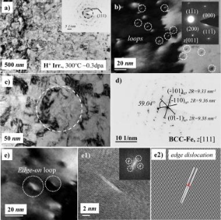 图3 300℃ H+辐照后NC样品的显微组织,约0.3 dpa。(a-c,e)显示辐照后显微组织的BF图像。(d)(c)中虚线圆圈所示选择区域的SAED图像。e1)描述(e)中位错结构的HRTEM图像。e2)(e1)的iFFT图像。