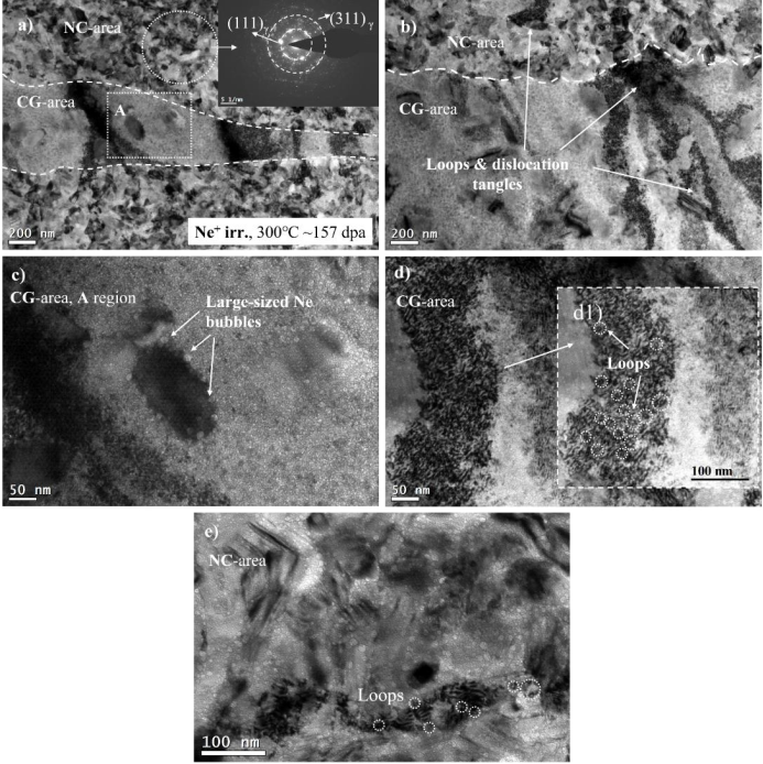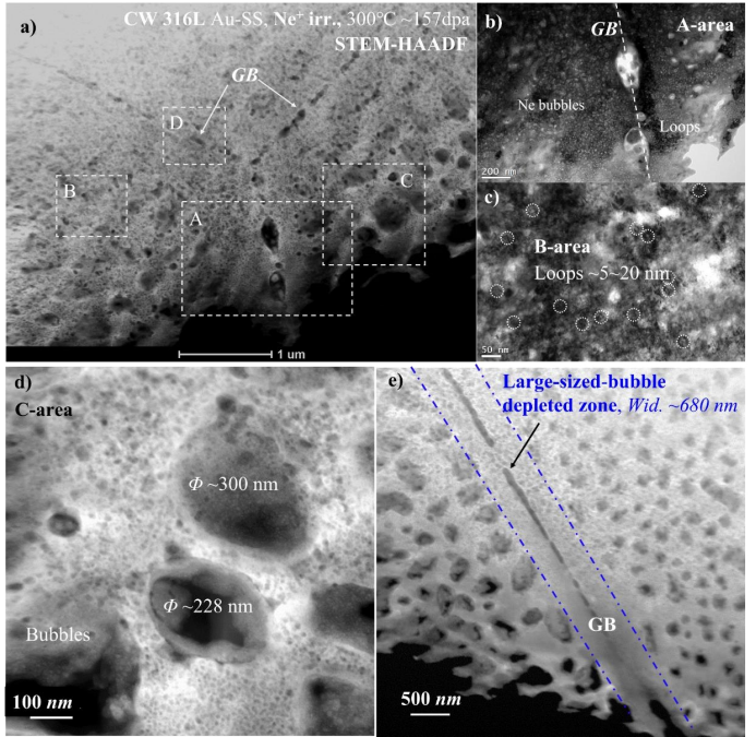 图10 CW样品经300℃ Ne+辐照后的显微组织,~157 dpa。a)STEMHAADF图像,显示了一个三重结GB。b)c)BF图像,显示了GB附近的位错环、空洞、Ne气泡和空洞贫化区。d)e)STEM-HAADF,显示了大尺寸气泡内部晶粒和沿着GB的大尺寸气泡贫化区。