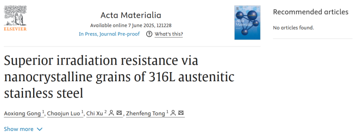 以上研究以“Superior irradiation resistance via nanocrystalline grains of 316L