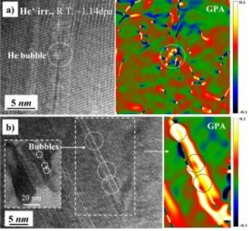 图5 a)b)RT He+辐照后NC样品中He气泡区域和GPA(εxy)的HRTEM图像,约1.14 dpa。