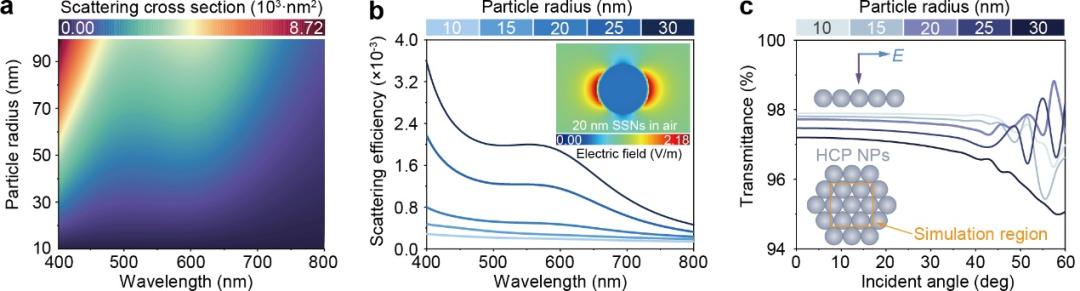 图2. 单个二氧化硅纳米颗粒的 (a) 散射截面与 (b) 散射效率随颗粒半径在400-800nm波长范围内的变化。(c) 二氧化硅纳米颗粒构成的等效层的透射率随颗粒半径在入射角度在0°到60°条件下的变化。