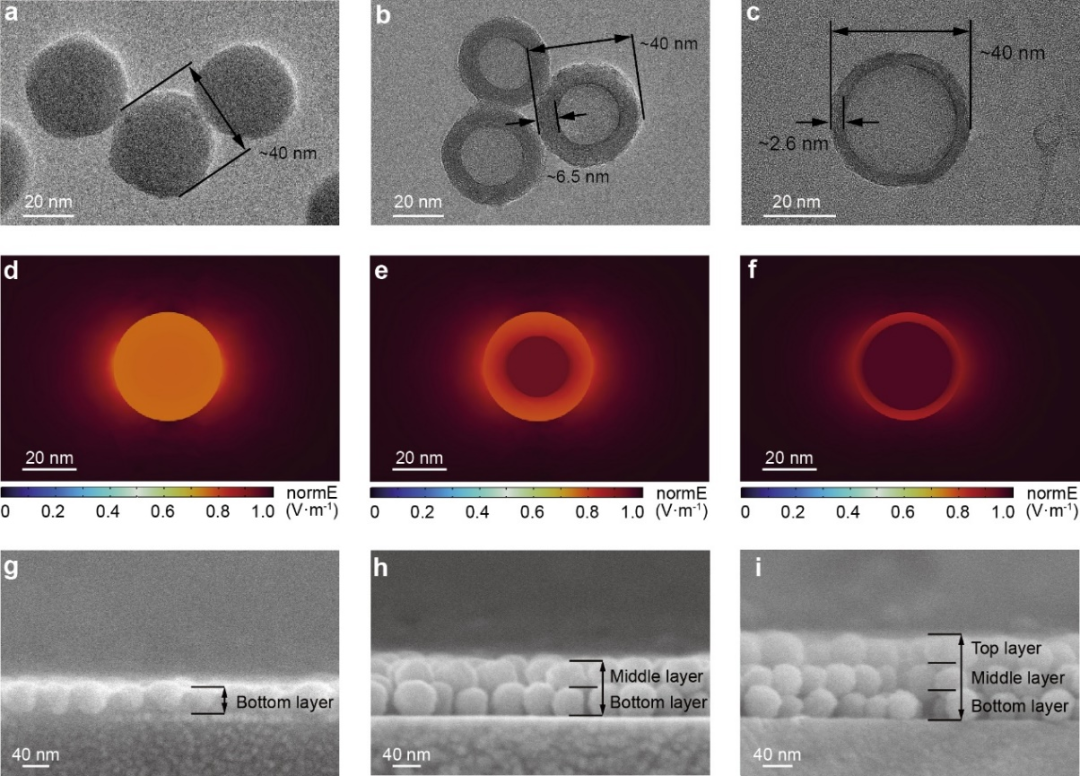 图3. (a) 底层的实心二氧化硅纳米颗粒以及 (b) 中间层和(c) 顶层的空心二氧化硅纳米颗粒的透射电镜图像。(d-e) 上述二氧化硅纳米颗粒对应的电厂密度分布图。沉积了 (g) 底层、(h)底层和中间层以及 (i) 底层和中间层和顶层二氧化硅纳米颗粒的扫描电镜界面图像。
