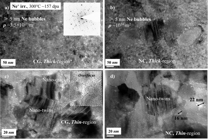 300 ℃ Ne +辐照后NC样品中Ne气泡在欠焦状态下的TEM BF图像,~157 dpa。a)B)较厚区域。c)d)较薄区域。