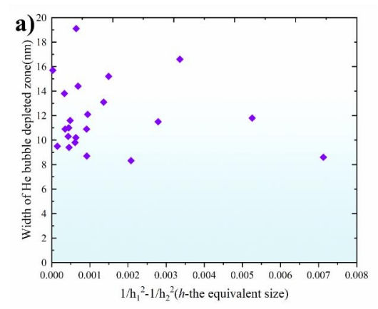 图7 a)氦泡贫化区与相邻晶粒等效尺寸差的关系。b)氦泡贫化区与GB角的关系。