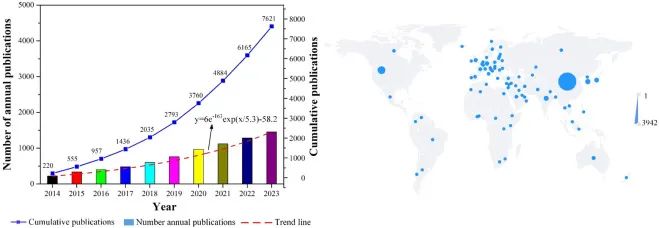 图2 PubMed文献数据库近年来检索到的高血压相关论文的趋势及地区分布。