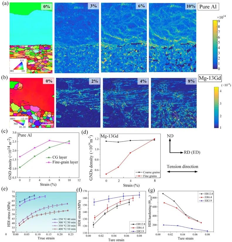 图19 (a)LS纯Al和(B)HLS Mg-13Gd合金在不同应变下的IPF和GND密度分布图,(c)和(d)GND密度随应变增加的相应变化,(e)不同退火处理的纯Al的HDI应力演变,(f)Mg-13Gd合金在不同挤压比下的HDI应力演变和(g)HDI硬化发展。