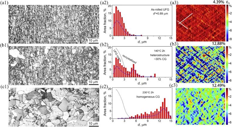 图26 三个样品的EBSD图像、晶粒尺寸的统计分布和DIC图像:(a1-a3)轧制UFG样品,(b1-b3)含~30%CG的BS样品,(c1-c3)均质CG样品。