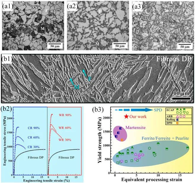 图13 马氏体-铁素体DPS中三种马氏体形态和分布的OM图像:(a1)孤立马氏体,(a2)链式马氏体,(a3)纤维状马氏体。(b1)马氏体-铁素体DPS中纤维状马氏体的SEM图像。(b2)不同压下量的冷轧和温轧样品的工程应力-应变曲线。(b3)与不同的SPD方法相比,温轧具有显著的强化效果。