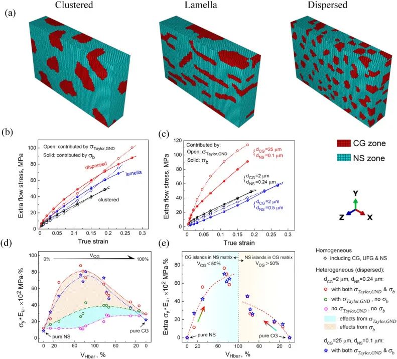 图37 (a)NS基体中具有聚集、层状和分散CG区域的异质结构Cu的三种区域配置示意图;(b)不同区域配置和(c)分散异质结构中不同机械不相容性的额外流动应力响应比较;(d)强度-延展性组合的指标(σy*Eu);(e)作为VHBAR函数的额外机械响应。