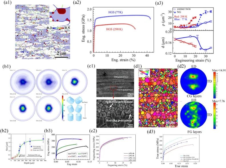 图9 (a1)SMGT制备的梯度结构(GS)Cu棒样品的模型图和扫描电子显微镜(SEM)图像,晶粒尺寸从梯度纳米晶(GNG)到CG。(a2)GNG,CG,和GNG/CG样品。