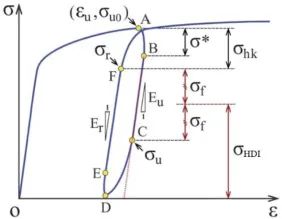 图4 LUR曲线中的卸载-再加载回路图及各点的物理意义:定义卸载屈服σu、再加载屈服σr、HDI应力σHDI、摩擦应力σf、粘性应力σ*、Eu的有效卸载杨氏模量、Er的有效再加载杨氏模量。