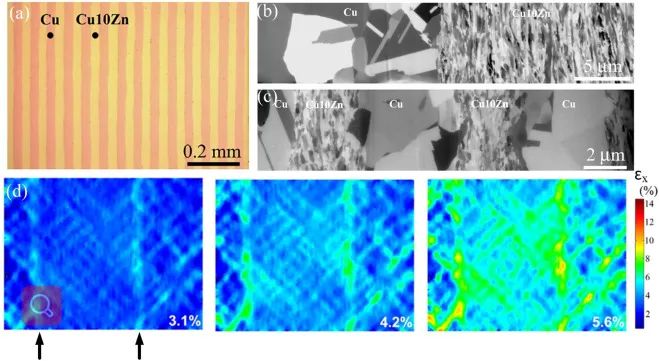 图24 LS铜-青铜层压板:(a)平均层厚为31µm的样品的OM;(b)和(c)ICCM图像,显示了平均层厚为62μm和3.7μm的层压板中的微观结构。(d)LS铜-青铜层压板在3.1%、4.2%和5.6%应变下的应变带(SB)的演变,通过高分辨率DIC测量。黑色箭头表示畴界面。