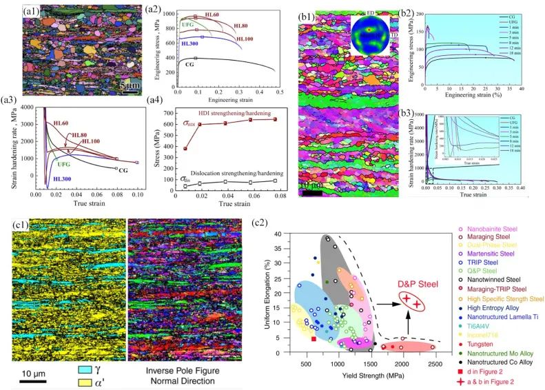 图31 两种HLS Ni:(a1-a3)LNR-500℃-13min样品的TEM图像,在颈缩处具有高密度位错结构的层状CG嵌入基体中;(b1-b3)LNR-500℃-13min样品的断口的SEM图像;(c1-c3)ECAP+LNR-475℃-5min样品的TEM图像,在颈缩处具有等轴CG嵌入UFG基体中;(d1-d3)ECAP+LNR-475℃-5min样品中断裂的SEM图像。