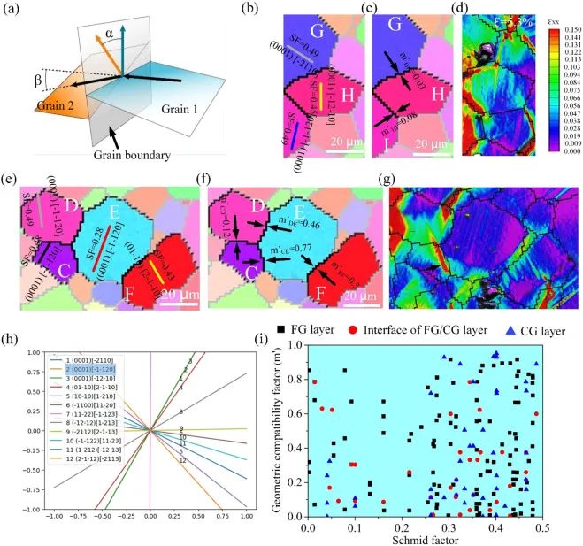图21 (a)相邻晶粒间的滑移面角度和滑移方向的模型图;(b-d),(e-g)在晶粒尺度水平上均匀Mg-13Gd样品的晶体学与局部微观应变之间的关系,(h)基于欧拉角计算的理论滑移迹线方向;(i)SF范围为0-0.5的m'分布。