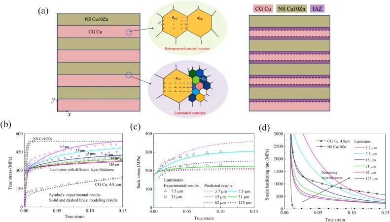 (b)YS-UE和(c)具有不同界面间距的LS铜/青铜层压板的加工硬化曲线。