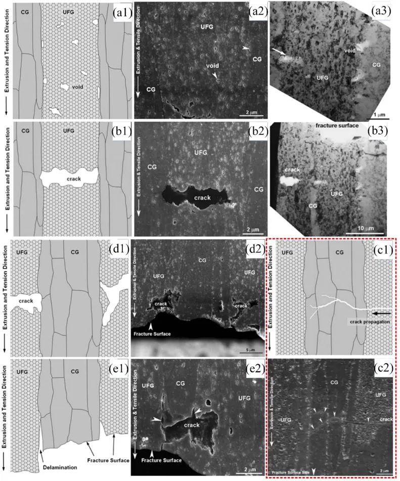 图33 BS Al-Mg合金中的示意图、SEM和TEM图像:(a1-a3)空隙萌生,(b1-b3)裂纹钝化;示意图和SEM图像:(c1,c2)裂纹偏转和分支,(d1,d2)裂纹桥接,(e1,e2)界面分层和失效。