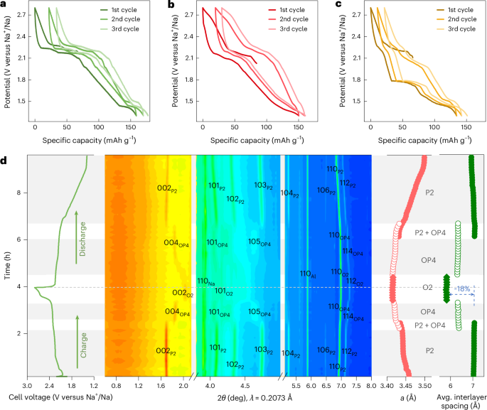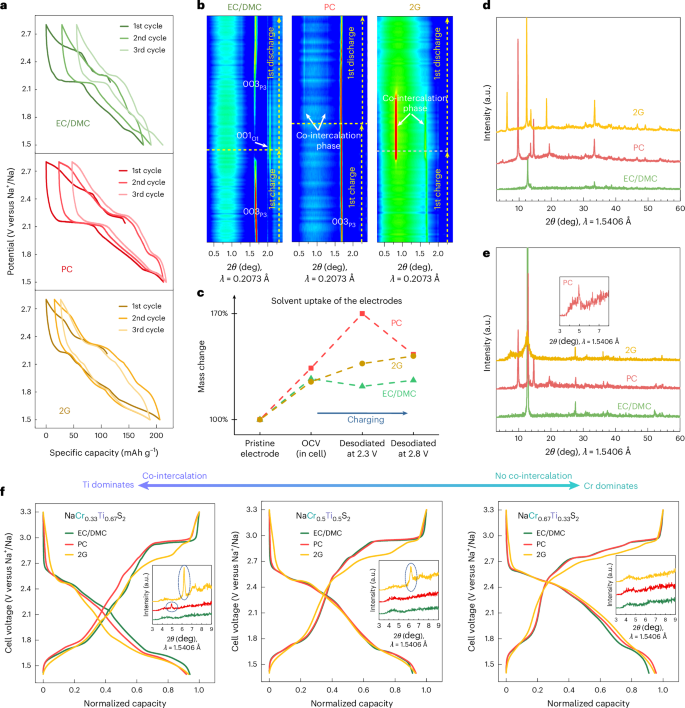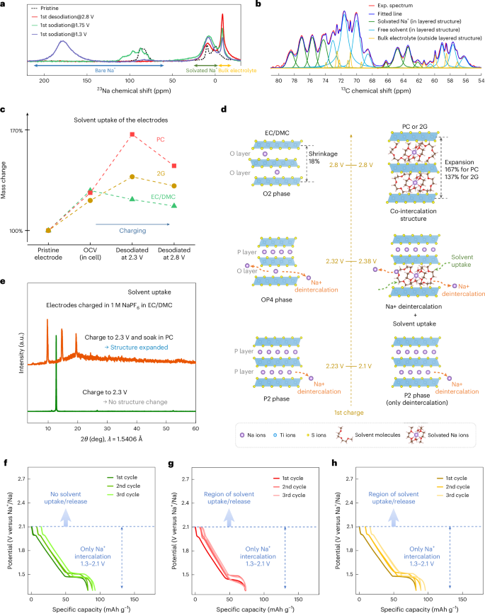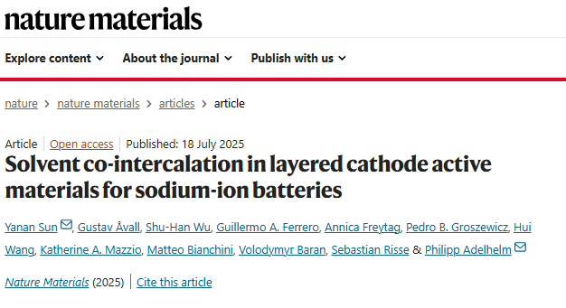 锂离子电池(LIBs)和钠离子电池(SIBs)通常依赖嵌入反应,锂离子或钠离子储存在电极的层状结构中,并在充放电过程中进行交换。电极由液态电解质隔开,电解质中离子被溶剂分子包裹形成溶剂化壳层。离子从电解质嵌入电极时需要脱去溶剂化壳层,反之,离子从电极脱出时会重新溶剂化。在某些情况下,溶剂化壳层未完全剥离,导致溶剂分子也一起嵌入电极,这种现象称为共嵌入(离子和溶剂分子共同嵌入)。共嵌入通常被认为是不利的,因为它会导致电极材料的劣化。 在现有的锂离子电池中,固态电解质界面(SEI)层有效阻止了溶剂的共嵌入。然而,共嵌入反应有时表现出高度可逆性和快速动力学,甚至能够持续数千次循环。其中典型例子是钠离子和二甘醇醚(diglyme)在石墨电极中的共嵌入反应。值得注意的是,溶剂共嵌入为设计电极反应提供了独特机会。例如,溶剂成为电极反应的一部分,能够有针对性地调控电极电位,调节幅度可达几百毫伏,具体取决于共嵌入的溶剂类型。另一个优势是通常限制嵌入反应速率的溶剂壳层剥离能量,在共嵌入过程中可被降低甚至绕过,从而提升能量效率和速率性能。 特别值得注意的是,尽管溶剂化钠离子的体积更大,但其在石墨中的扩散速率快于锂离子。共嵌入的缺点是溶剂化离子尺寸较大,会导致电极体积膨胀幅度更大,同时在石墨中比传统嵌入过程的比容量降低超过三分之二,影响能量密度。此外,需要过量电解质也是实际应用中的挑战,但通过优化电解质和电极,有可能减少电解质用量,例如避免在SEI形成过程中的不可逆电解质消耗。 虽然大多数共嵌入研究集中于石墨负极,但共嵌入在正极活性材料(CAMs)中的研究非常有限,且对于其在电池中的性质和可行性认识不足。近期研究表明,钛二硫化物(TiS2)能够共嵌入钠离子和二甘醇醚分子。另有研究显示,TiS2在高温条件下可以实现Mg2+和Ca2+与碳酸丙烯酯(PC)的共嵌入,但循环性能依然面临挑战。尽管这些研究推动了新型电极反应的探索,TiS2本身并非真正意义上的正极活性材料,因为其不含钠或其他碱土金属离子,难以从商业角度实现电池在放电态的组装。 鉴于此,德国柏林洪堡大学Philipp Adelhelm团队在“Nature Materials”期刊上发表了题为“Solvent co-intercalation in layered cathode active materials for sodium-ion batteries”的最新论文。本文针对一系列NaxMS2(M为Ti、V、Cr及其混合物)化合物,使用不同溶剂(包括二甘醇醚、碳酸丙烯酯以及碳酸乙烯酯/碳酸二甲酯混合溶剂)系统研究了钠离子的溶剂共嵌入反应。作者证明了钠离子在CAMs中的共嵌入现象,并揭示了一种溶剂和离子相反流动的反应机制。在理论计算和实验验证的指导下,提出了基于层间结合能和层间自由体积的模型,来预测层状CAMs中的溶剂共嵌入行为。共嵌入的表现由相结构、钠含量、过渡金属及阴离子种类以及溶剂性质共同决定。 (1)实验首次系统研究了钠层状硫化物正极活性材料NaxMS2(M=Ti、V、Cr及其混合物)中钠离子与多种溶剂的共嵌入现象,得到了不同条件下共嵌入对材料相变、电极膨胀、氧化还原电位和循环性能的影响规律。 (2)实验通过结合多种溶剂(包括二甘醇醚、碳酸丙烯酯及碳酸乙烯酯/碳酸二甲酯混合溶剂)与NaxMS2正极材料进行电化学测试和结构分析,发现共嵌入过程中存在溶剂与钠离子相反方向的通量;通过理论计算与实验验证,提出了层间结合能与层间自由体积模型,能够有效预测共嵌入行为。 (3)共嵌入不仅改变了材料的层状结构和溶剂化离子含量,还导致电极体积膨胀加剧,同时调控了电极的氧化还原电位。此外,共嵌入能够绕过离子脱溶剂化的能量障碍,提高了反应动力学和循环稳定性。这些发现为设计结构多样、性能可调的钠离子电池正极材料提供了新的思路和理论指导。 图1. P2-NaₓTiS₂的电化学行为 图2. PC和2G基电解液中因共嵌入导致的大晶格膨胀 图3. 层状硫化物正极中溶剂共嵌入的机制 图4. 层状硫化物和氧化物的层间结合能与层间自由体积 图5. 其他层状硫化物中的溶剂共嵌入 本文系统揭示了溶剂共嵌入作为一种调控钠离子电池正极活性材料性能的新机制,突破了传统仅关注离子单独嵌入的研究视角。研究发现,溶剂分子不仅能与钠离子共同进入层状结构,而且在特定条件下溶剂与离子呈现相反的物质通量,这种复杂的嵌入行为对材料的相变、结构稳定性及电化学性能产生深远影响。通过理论计算与实验验证,建立了层间结合能与自由体积相结合的模型,能够有效预测不同材料与溶剂体系中的共嵌入倾向,指导未来电极材料的设计和优化。此外,溶剂共嵌入可实现电极反应电位的精准调控,降低嵌入过程的能量障碍,从而提升电池的能量效率和充放电速率。该机制不仅为钠离子电池领域开辟了新的研究方向,也为开发结构多样化、性能优异的层状电极材料提供了理论基础和技术路径,推动了高性能、长寿命电池的创新发展。未来结合溶剂分子设计与电极材料调控,将极大丰富电池体系的功能与应用潜力。