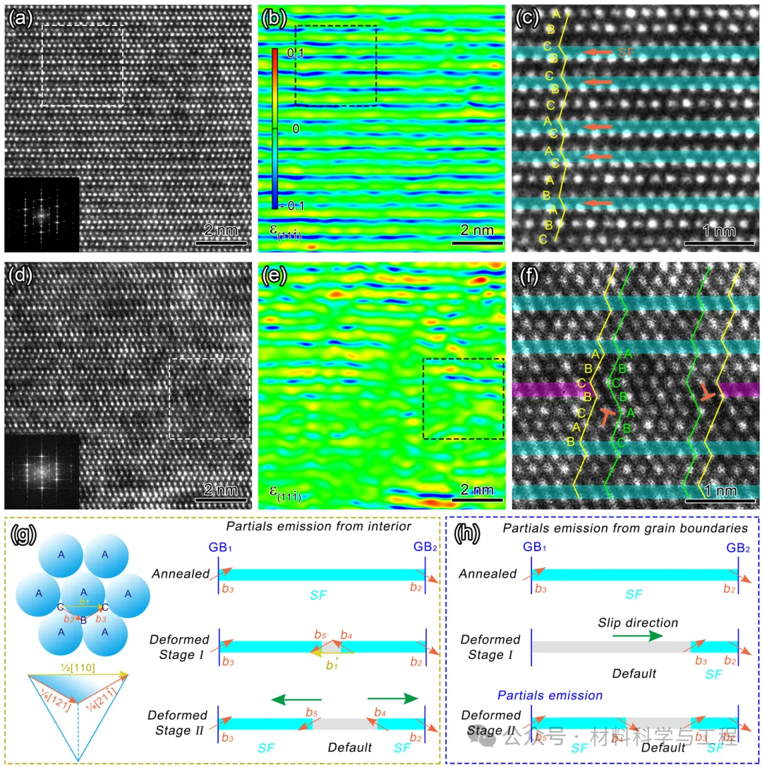 Fig. 5. UST3 样品拉伸变形过程中的退层错行为:(a) 未变形样品的高分辨微观结构图;(b) 在{11-1}方向对同一区域进行几何相位分析(Geometric phase analysis , GPA);(c) 图(a)中白色虚线框中原子像的放大图, 显示了高密度的层错;(d) 拉伸变形后的高分辨微观组织;(e) 对应的GPA图;(f) 图(d)中白色虚线框中原子像放大图, 显示了退层错行为的发生使部分区域恢复近乎完美的FCC晶格;(g) 和 (h) 两种“退层错”变形机制。