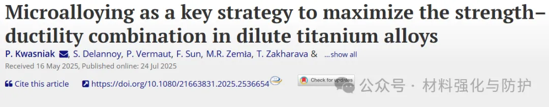 2025年7月24日国际期刊《Materials Research Letters》上在线发表了一篇题为“Microalloying as a key strategy to maximize the strength–ductility combination in dilute titanium alloys”的研究论文,报道了通过少量铼(Re)进行微合金化,从而激活纳米β相的析出强化机制,实现了2.8倍的屈服强度提升,并且依然保持有34%的高延伸率。
