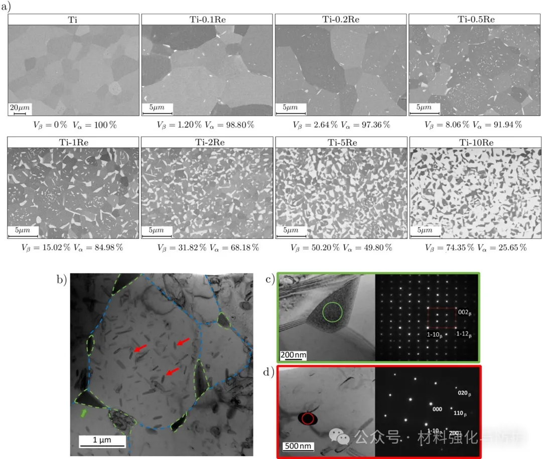 通过XRD、EBSD与TEM分析研究揭示,在Re添加量为0.1–0.5 wt.%区间时,材料内部形成两类β相:一类为晶粒内部的细长条状纳米β析出物,另一类为晶界上的楔形β粒子,其结合晶粒尺寸的急剧减小(从80µm降至4µm),实现了位错运动的强烈抑制与应变硬化能力的保持。