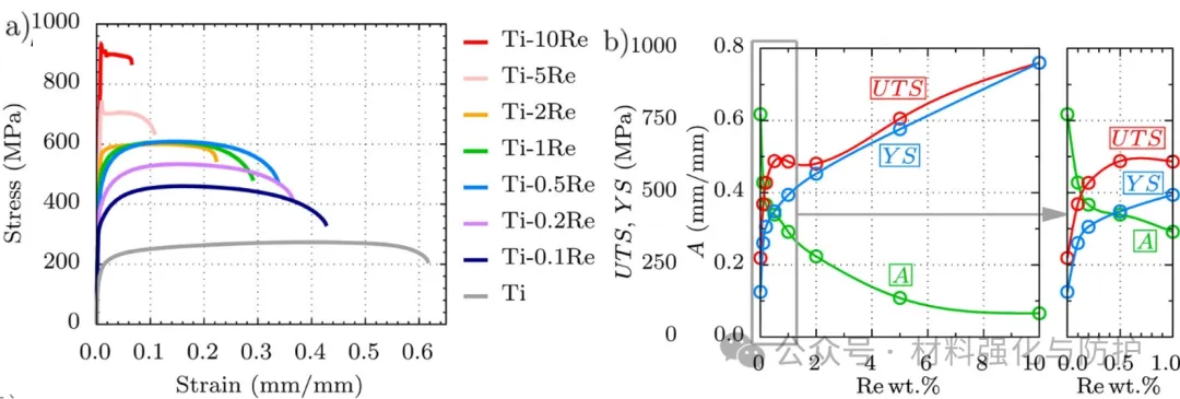拉伸测试结果显示,Ti–0.5Re合金的屈服强度高达439 MPa(对比纯Ti为156 MPa),同时延伸率保持在34%。在超低合金元素含量条件下实现高强高延展的协同提升,在以往研究中较为罕见。