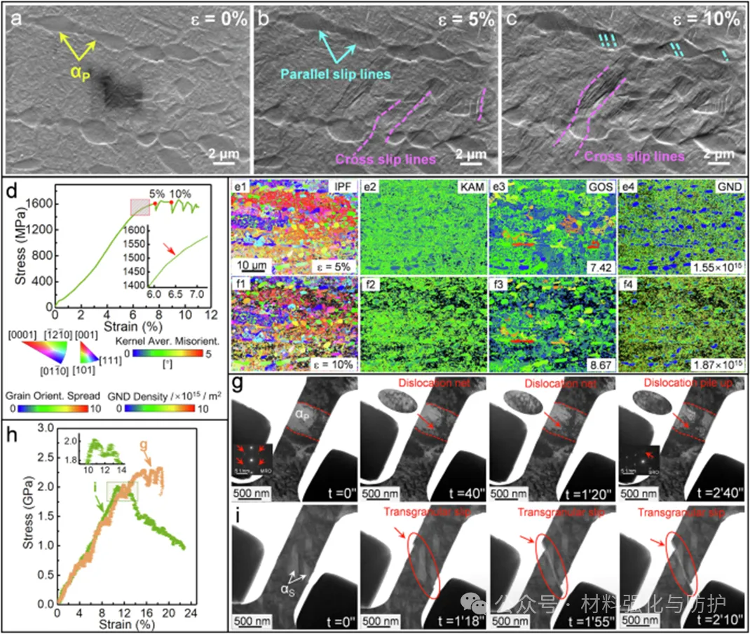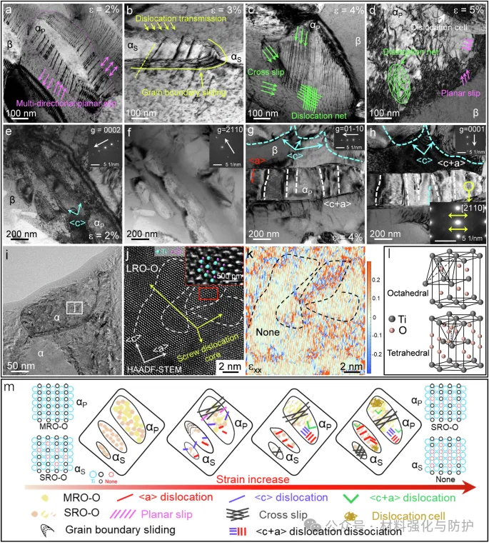 该研究发现5%应变下明显存在交叉滑移,而10%应变下拉伸载荷超过了附加滑移系统的临界分离剪应力,αP晶粒中出现额外的滑移线。其中LRO-O结构通常促进晶粒内均匀位错分布。此外,交叉滑移或多滑移系统的激活可以局部增加 GND 密度,而不会显著改变晶体取向,从而保持相对较低的 KAM 和 GOS 分布。因此,0.36 O合金表现出优异的变形均匀性,能够承受极端的塑性变形。