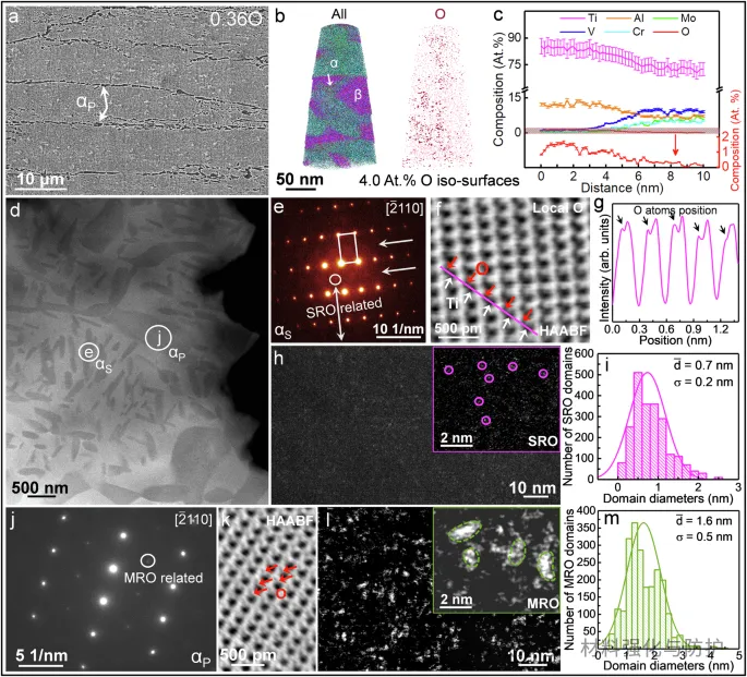 该0.36 O合金的显微组织表现出明显的层状结构,αP相具有明显的链状形貌。合金的三维重建揭示了 4At.%O 的O等浓度表面表明O在合金的α相中相对均匀地分散,其分布表现为纳米级的 LRO 结构。