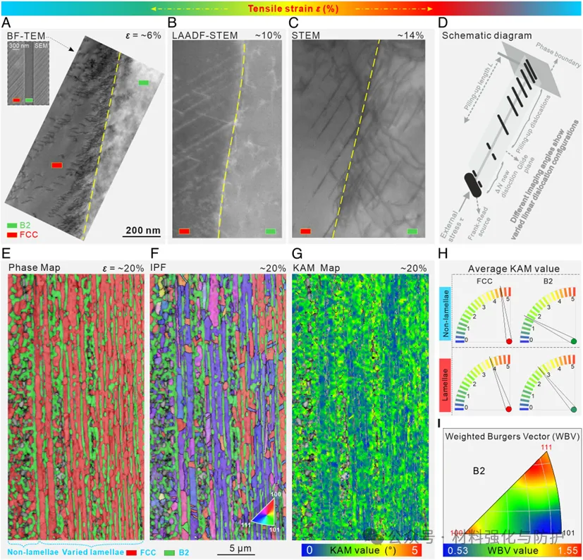 HLS结构中产生了高达610MPa的异质变形诱导(HDI)应力,不仅在FCC相中形成大量位错堆积、层错与纳米孪晶,更在B2相中激发出<111>型滑移系,显著改善了其本征脆性问题,这种多尺度和多机制的协同作用共同赋予了材料的高应变硬化能力和塑性。作者基于第一性原理计算还证实了该合金体系中FCC相的层错能高达3 mJ/m²,理论上并不容易发生孪生,但由于高HDI应力的推动,仍成功激发了大规模的纳米孪晶行为。