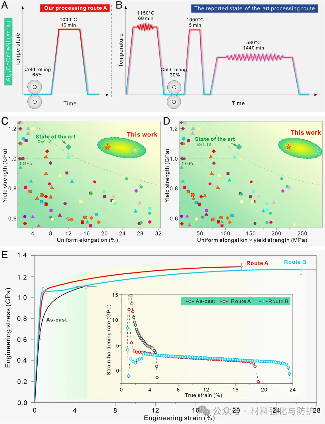 在这项工作中,团队提出了一种微观结构的多尺度设计策略,其创新性地以“继承”的方式,基于铸态的三相层状结构进行精准调控,通过快速且简单的工艺方案成功实现了高强高塑的协同突破,这一项研究不仅仅刷新了关于Al0.7CoCrFeNi MPEA体系报道的力学性能上限,也为其他多相合金体系提供了结构优化的思路。
