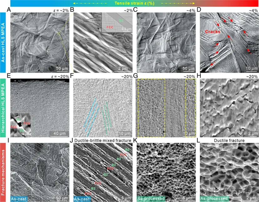 HLS结构中双相层片协同塑性变形形成了有效的裂纹缓冲区,即使在B2相中能够观察到在断裂端附近存在许多的微裂纹,但其强双相异质变形的片层区可以有效地抑制从相邻的弱片层区和非片层区侵入的一些较大且较长的裂纹的生长/扩展,裂纹尖端被层片结构阻挡而难以扩展或聚合,从而显著推迟了整体破坏的发生。