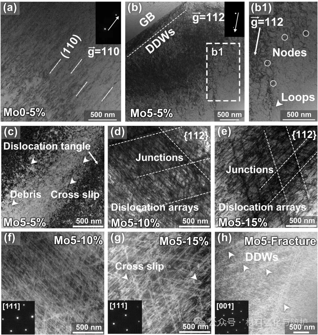团队设计的Ti40Nb30V20Zr5Mo5合金在室温下表现出867MPa的屈服强度与26%左右的延伸率,并在1073K的高温下仍保持超过500MPa的抗拉强度,这样优异的性能组合来源于Mo的引入,团队发现,Mo能够显著增加晶格模量错配和不均匀原子应变场,同时促使位错在滑移过程中更易发生交滑移与缠结,最终表现为在合金内构建更为复杂的位错亚结构网络。