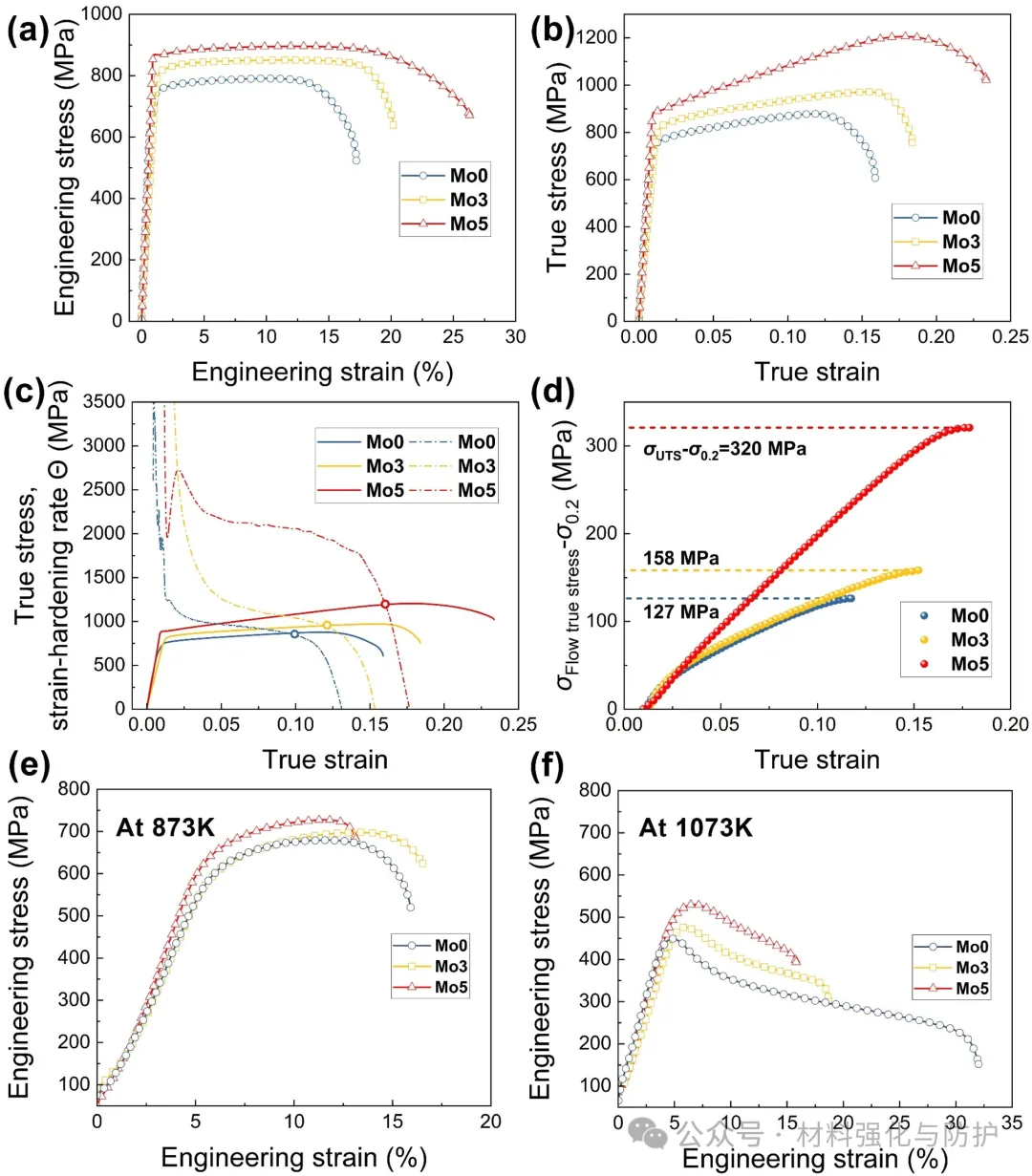 Mo元素的引入协同提升了合金的强塑性,Mo5在室温下的屈服强度比Mo0提高了20%,达到了867MPa,同时延伸率提高至25%左右,应变硬化速率稳定保持在约2GPa,Mo5在拉伸过程中应变分布更加均匀,相比Mo0有效延缓了局部颈缩的发生。