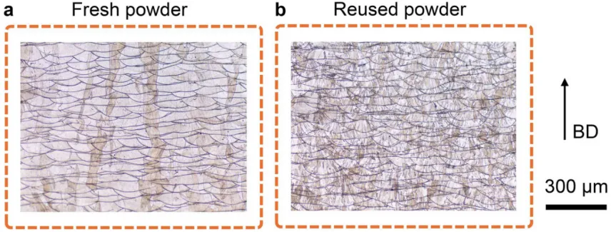 图1.概述 LPBF 316 L 不锈钢样品的 (a) 新鲜粉末与 (b) 重复使用粉末的 OM 图像。