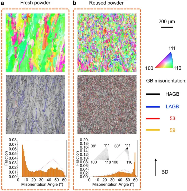图2.EBSD IPF(第一行)、重叠GB的图像质量图(第二行)、取向错误角度分布和相应的取向错误轴(第三行),显示了使用(a)新鲜粉末与(b)重复使用粉末的竣工样品的微观结构。在 GB 地图中,黑线表示 HAGB (θ > 15°),蓝线表示 LAGB (θ ≤ 15°),红线表示 Σ3 边界 (60°/<111>),黄线表示 Σ9 边界 (39°/<110>)。定向错误角度图中的虚线显示了定向错误角度的麦肯齐(随机)分布。