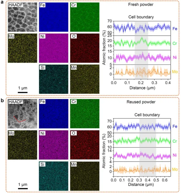 图5凝固细胞结构的STEM-HAADF 成像和相应的 EDS 图显示了 (a) 新鲜粉末和 (b) 重复使用的粉末样品中的元素分布。每个图中的线性剖面显示了跨单元边界的 Fe、Cr、Mo 和 Ni 的原子分数。HAADF 图像中的黑色箭头表示线扫描的位置,而重复使用的粉末样品的 HAADF 图像中的红色箭头标记氧化物的位置。