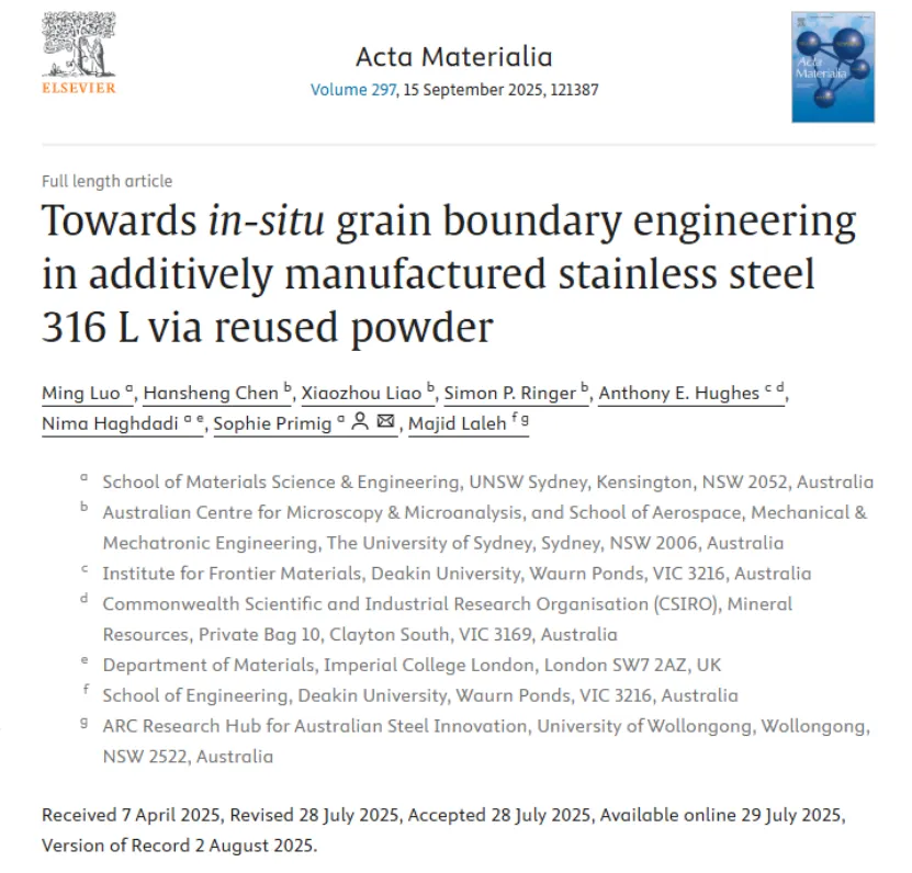 相关研究以“Towards in-situ grain boundary engineering in additively manufactured stainless steel 316 L via reused powder”发表在Acta Materialia