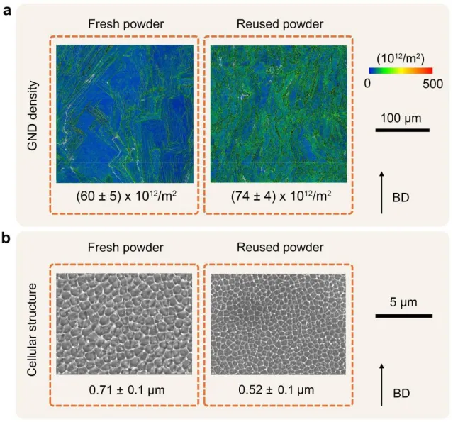 图3.LPBF 316 L在各种粉末条件下的显微结构特征,(a)图像质量图叠加GND密度,其中图中的数字显示了从多个图中计算出的平均GND密度,排除了GB,以及(b)来自蚀刻表面的SEM二次电子图像显示了细胞结构,图像中的数字表示来自不同图的细胞的平均直径。