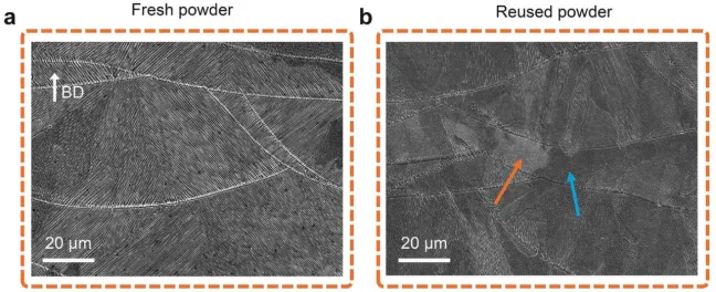 图4蚀刻后的SEM图像揭示了使用(a)新鲜粉末和(b)重复使用粉末制造的LPBF 316 L不锈钢的结构差异。重复使用的粉末表面呈现出鱼鳞状结构,橙色箭头表示细胞结构,蓝色箭头突出显示没有这种结构的区域。