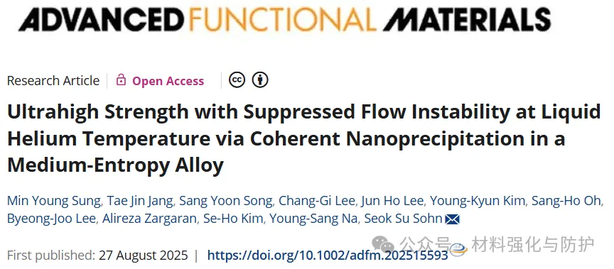 近日,韩国高丽大学Seok Su Sohn教授团队开发出一种新型Co36Ni46Mo11Al7中熵合金,在液氦温区(4.2K)下展现出高达2.1GPa的超高强度和50%的延展性,成功突破了低温合金中强度与稳定性的长期矛盾。目前这一研究成果已于2025年8月27日在《Advanced Functional Materials》期刊上以题为“Ultrahigh Strength with Suppressed Flow Instability at Liquid Helium Temperature via Coherent Nanoprecipitation in a Medium-Entropy Alloy”的研究论文形式公开发表。