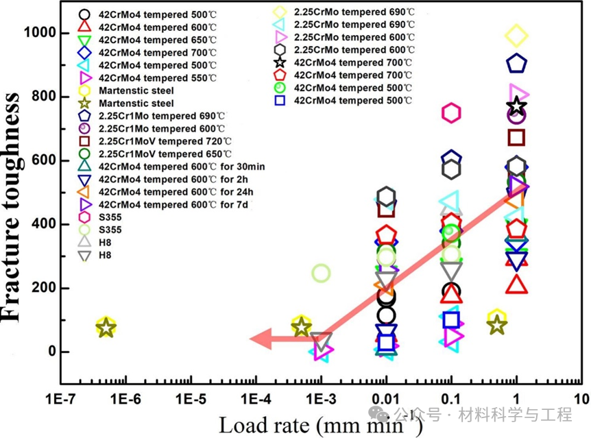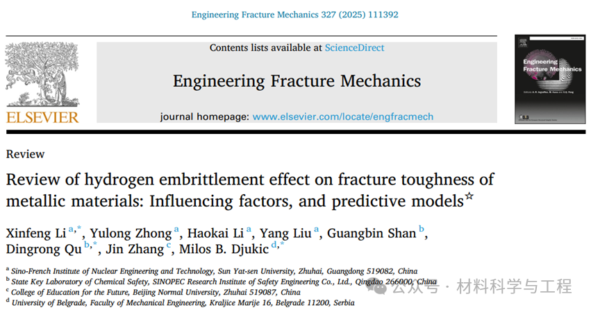 氢能是一种清洁、低碳、高效的二次能源,正逐步成为全球能源结构转型的重要载体之一。高压气态氢是氢气最常用的储运形式。然而,大多数工程材料在氢气环境中力学性能显著下降,即氢脆(Hydrogen Embrittlement, HE),这一问题是制约氢储运装备安全运行的核心难题。 与拉伸和疲劳性能相比,临氢合金的断裂韧性是衡量材料抵抗裂纹萌生与扩展的关键断裂力学参数,对工程结构安全设计、材料研发和事故预防至关重要。根据国内外相关标准,输氢管材的断裂韧性要大于55 MPa·m0.5,以确保管道的结构完整性。 针对上述问题,中山大学李新锋课题组联合国内外知名机构在断裂力学权威期刊Engineering Fracture Mechanics发表题为“Review of hydrogen embrittlement effect on fracture toughness of metallic materials: Influencing factors, and predictive models”的长篇综述论文(48页),系统总结氢对金属材料断裂韧性的影响因素及预测模型,核心内容包括: 1. 断裂韧性测试方法的最新进展 综述国内外主流断裂韧性测试技术,重点分析单边缺口弯曲(SENB)试样在氢环境下的适用性与发展趋势。 2. 氢对典型金属材料断裂韧性的影响 系统总结了氢对输氢管线钢、储氢压力容器用钢等常用结构材料断裂韧性的削弱效应,并提出优化建议。 3. 临氢合金断裂韧性的关键影响因素 深入探讨微观组织特征、加载速率、氢压/氢浓度、温度等多因素耦合作用对断裂韧性的影响规律。 4. 临氢合金断裂韧性的预测模型 总结并对比HEDE、HELP及其协同模型(HELP+HEDE)下的多种断裂韧性预测模型,并明确其适用范围与失效准则。 目前,李新锋课题组围绕临氢合金氢脆机理、评估和寿命预测研究方向,发表4 篇高水平综述论文,相关论文信息如下: Li et al., Engineering Fracture Mechanics, 2025, 111392. Li et al., International Journal of Hydrogen Energy, 2024, (72), 74-109.(高被引) Li et al., Journal of Materials Science & Technology, 2022, (122), 20-32.(优秀论文) Li et al., Acta Metallurgica Sinica (English Letters), 2020, 33 (6), 759-773. (高被引) 图1 断裂韧性与试样厚度的关系 图2 代表性的J-R阻力曲线(包括实验数据点、构造线和限制边界) 图3 断裂韧性对加载速率的依赖性 图4 不同氢压/氢浓度下合金的断裂韧性